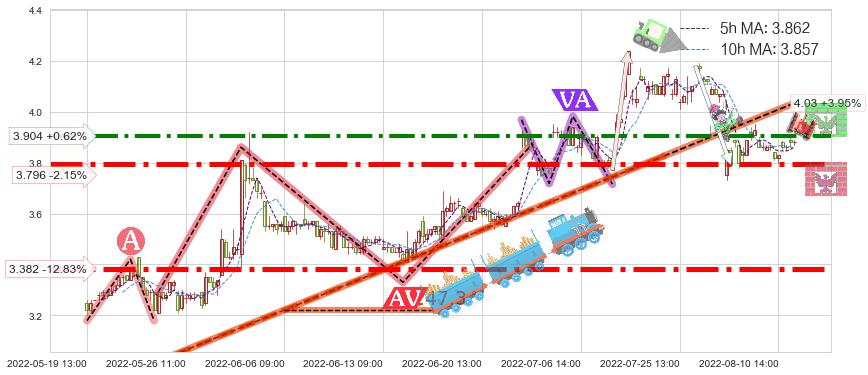 ♘ 阻力价格位3.904,可信任强度81.91%,距离最后交易2022-08-12 14:00形成的收盘价格3.880相差 +0.62%