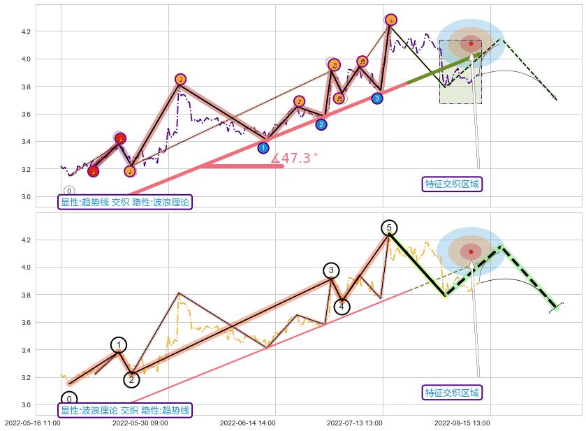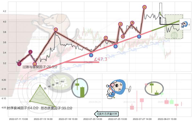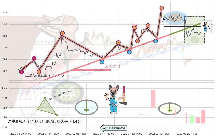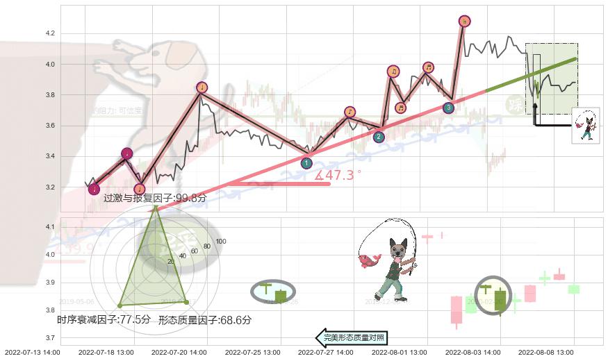 ➢ 2022-05-19 13:00-2022-07-21 13:00上升趋势存在反转[风险],其原上升趋势的支撑位(4.03)已破位[强阻力信号],原上升趋势角度: 47.3˚