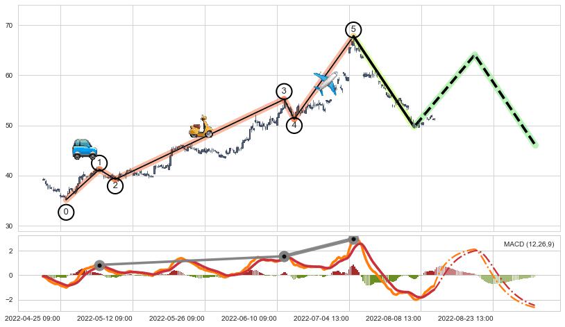 ➢ 最后的上涨趋势2022-04-25 14:00至2022-07-18 13:00:存在破位迹象,后续小调整或者反转下跌