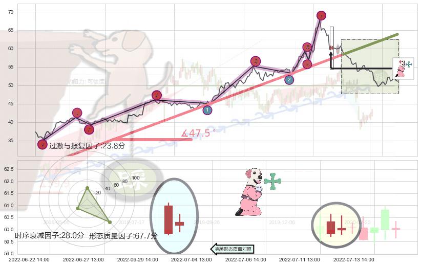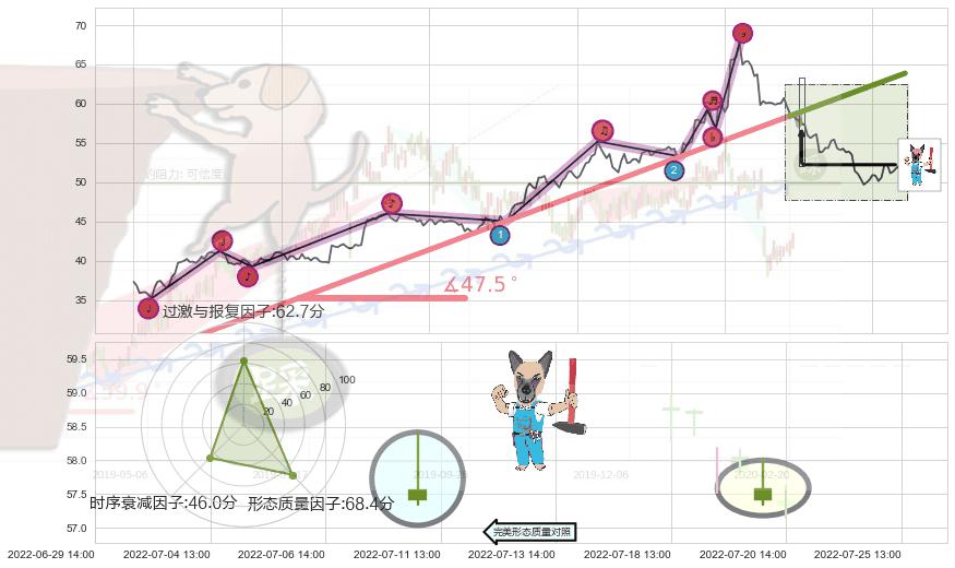 ➣ 2022-04-25 14:00-2022-07-18 13:00上升趋势存在反转[风险],其原上升趋势的支撑位(63.87)已破位[强阻力信号],原上升趋势角度: 47.5˚