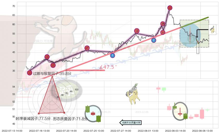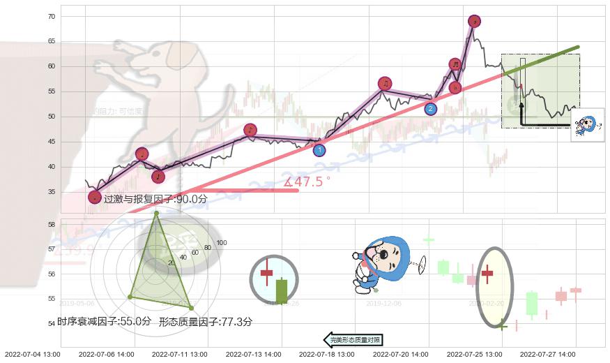 从2022-04-25 14:00至2022-07-18 13:00,共包含217个小时,阶段股价上涨54.06%,阶段股价变动位移路程比: 1 : 4,上涨趋势角度: 47.5