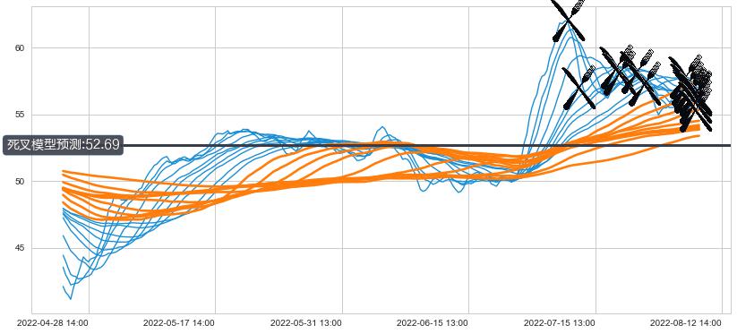 ➣ 60小时均线于(08-09 14:00: 57.72)形成【死叉】基于【死叉历史模型】预测死叉后最低波谷价格: 53.20, 死叉后最低价格55.04,尚未达到预测最低波谷价格, 预期继续下跌