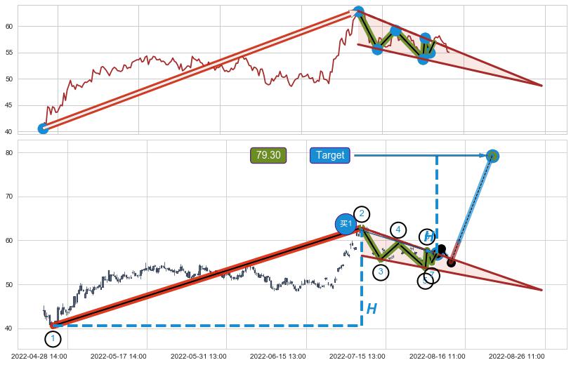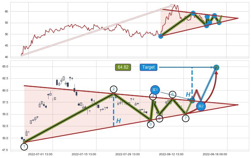 ➢ 最小中继整理涨幅→𝐇: 22.32 (𝐇楔型旗杆的长度:楔型起点→顶点)