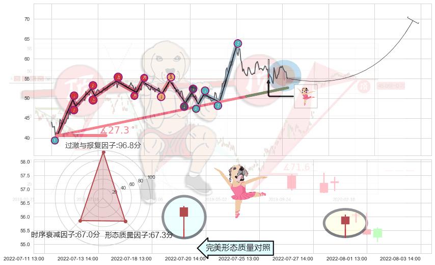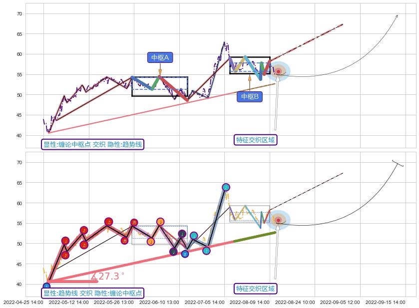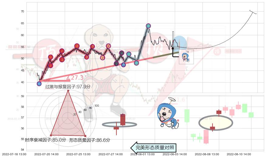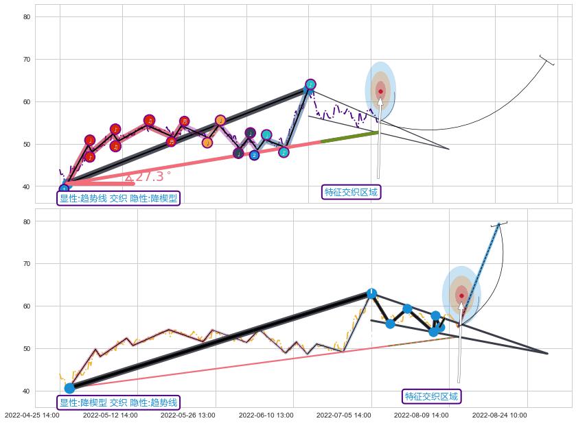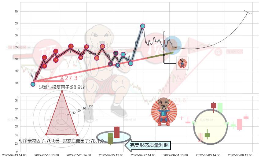 从2022-04-27 09:00至2022-07-13 13:00,共包含206个小时,阶段股价上涨34.78%,阶段股价变动位移路程比: 1 : 6,上涨趋势角度: 27.3