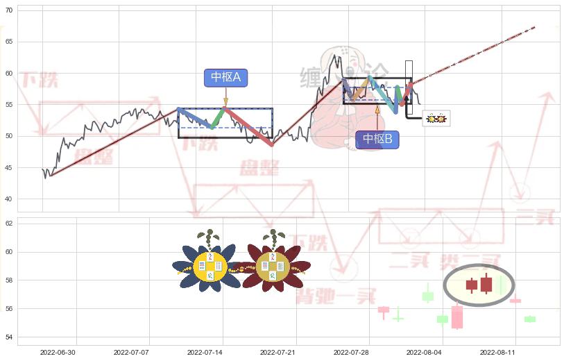 ➣ 【中枢B】:07-08:14-08-09:14,中枢由7笔构成,共45交易小时, ZG=57.73, ZD=55.69
