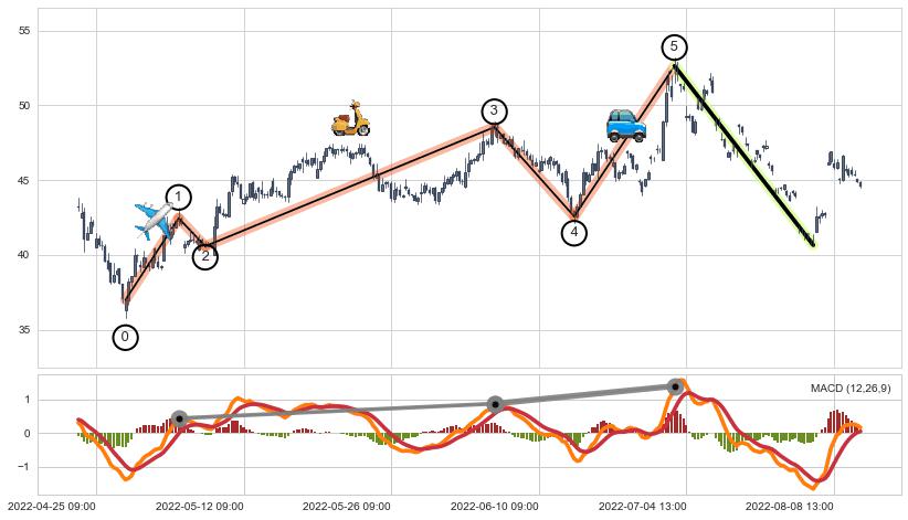 从2022-04-14 11:00至2022-05-05 13:00,共包含62个小时,阶段股价上涨8.25%,阶段股价变动位移路程比: 1 : 9