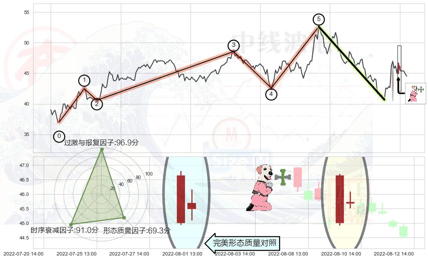 从2022-08-02 14:00至2022-08-12 14:00,共包含17个小时,阶段股价上涨9.71%,阶段股价变动位移路程比: 1 : 3,2022-08-05 13:00向⇪形成缺口,跳空上涨+8.37%