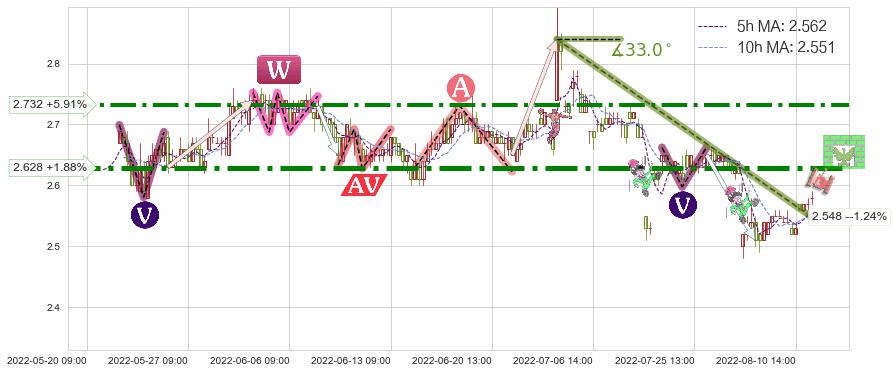 ♘ 阻力价格位2.628,可信任强度90.01%,距离最后交易2022-08-12 14:00形成的收盘价格2.580相差 +1.88%