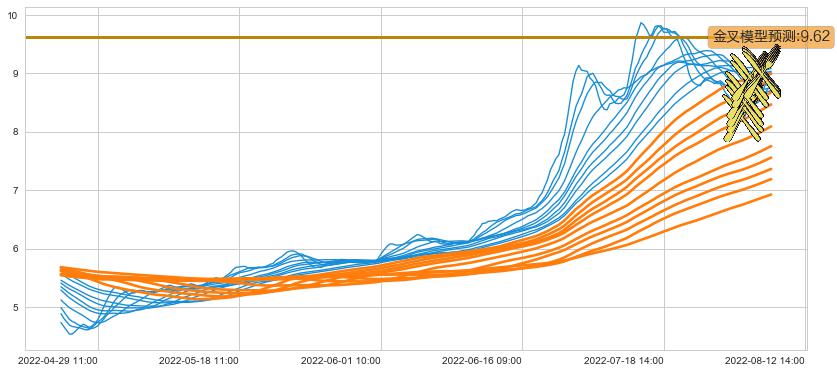 ➣ 45小时均线于(08-10 14:00: 9.06)形成【金叉】基于【金叉历史模型】预测金叉后最高波峰价格: 9.91, 金叉后最高价格9.34,尚未达到预测最高波峰价格, 预期继续上涨