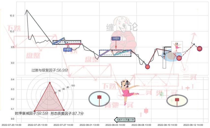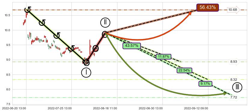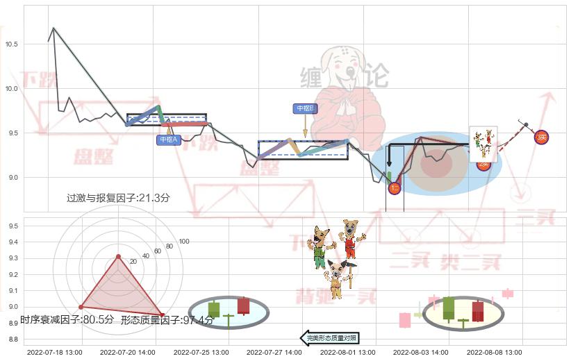 从2022-06-20 14:00至2022-08-10 13:00,共包含74个小时,阶段股价下跌-14.36%,阶段股价变动位移路程比: 1 : 4,2022-06-21 13:00向↘︎形成缺口,跳空下跌-8.71%˚
