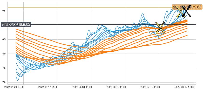 ➢ 34小时均线于(08-11 14:00: 9.48)形成【死叉】基于【死叉历史模型】预测死叉后最低波谷价格: 8.94, 死叉后最低价格9.45,尚未达到预测最低波谷价格, 预期继续下跌
