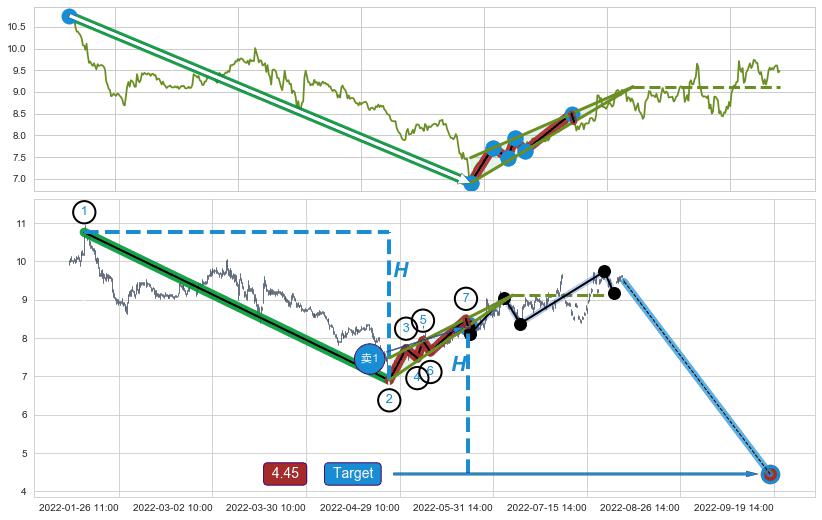 从2022-01-28 09:00至2022-02-09 10:00,共包含17个小时,阶段股价上涨8.45%,阶段股价变动位移路程比: 1 : 2