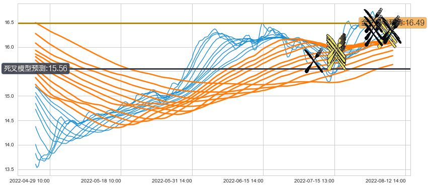 ➣ 45小时均线于(08-12 13:00: 16.30)形成【死叉】基于【死叉历史模型】预测死叉后最低波谷价格: 15.45, 死叉后最低价格16.32,已经下跌超出预测最低波谷价格, 预期反弹