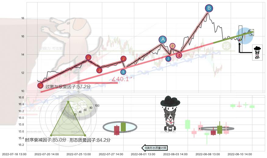 ➢ 2022-05-25 10:00-2022-07-22 14:00上升趋势存在反转[风险],虽然原上升趋势的支撑位(16.48)已破位,但其支撑效果尚存,原上升趋势角度: 40.1˚