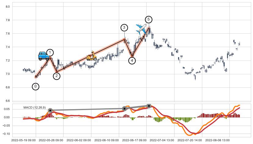 从2022-05-24 14:00至2022-06-27 14:00,共包含98个小时,阶段股价上涨6.96%,阶段股价变动位移路程比: 1 : 6