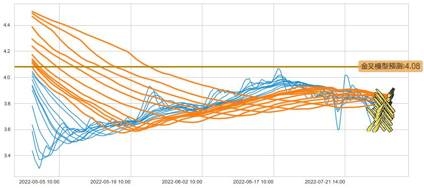 ➣ 40小时均线于(08-10 13:00: 3.777)形成【金叉】基于【金叉历史模型】预测金叉后最高波峰价格: 4.07, 金叉后最高价格3.890,尚未达到预测最高波峰价格, 预期继续上涨