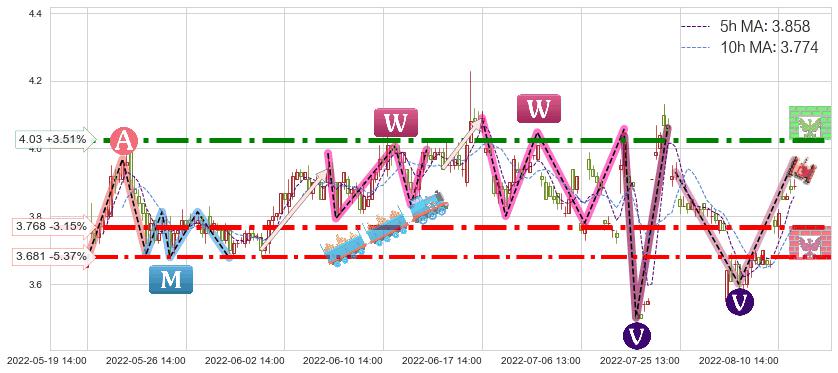 ♘ 阻力价格位4.03,可信任强度97.00%,距离最后交易2022-08-12 14:00形成的收盘价格3.890相差 +3.51%