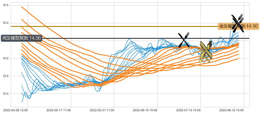 ➢ 13小时均线于(08-12 13:00: 14.93)形成【死叉】基于【死叉历史模型】预测死叉后最低波谷价格: 14.62, 死叉后最低价格14.89,尚未达到预测最低波谷价格, 预期继续下跌