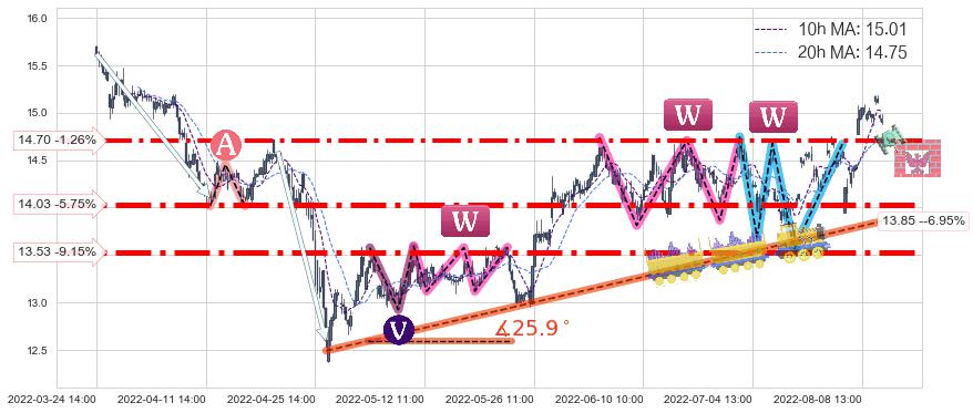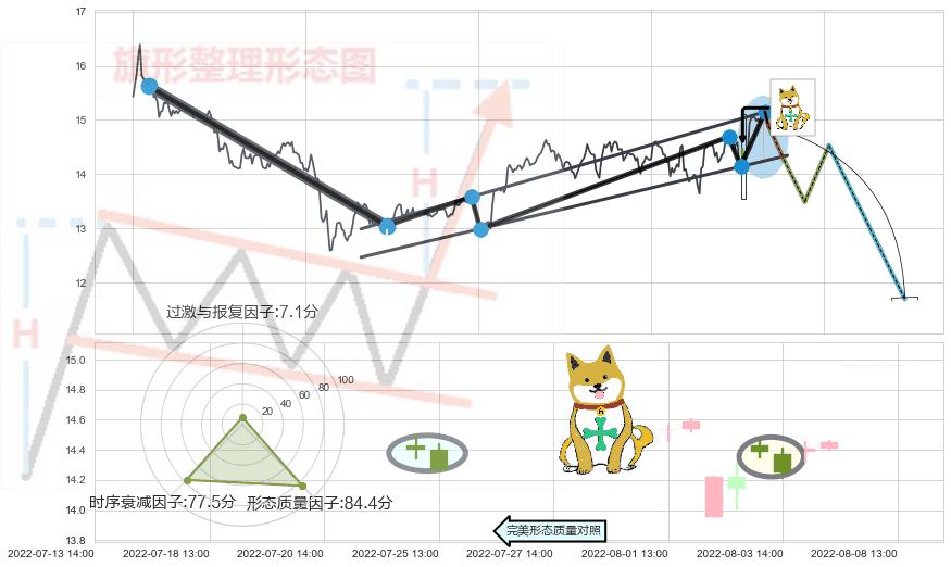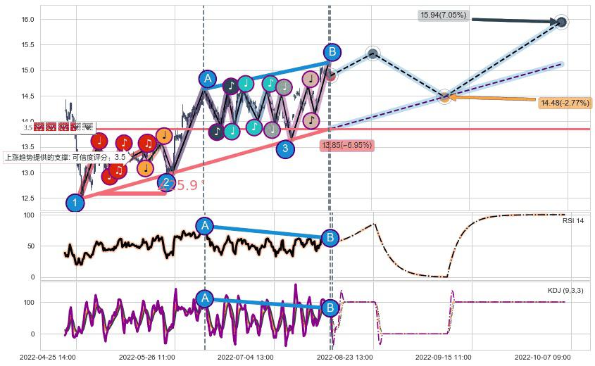 ♘ 支撑价格位14.03,可信任强度89.90%,距离最后交易2022-08-12 14:00形成的收盘价格14.89相差 -5.75%