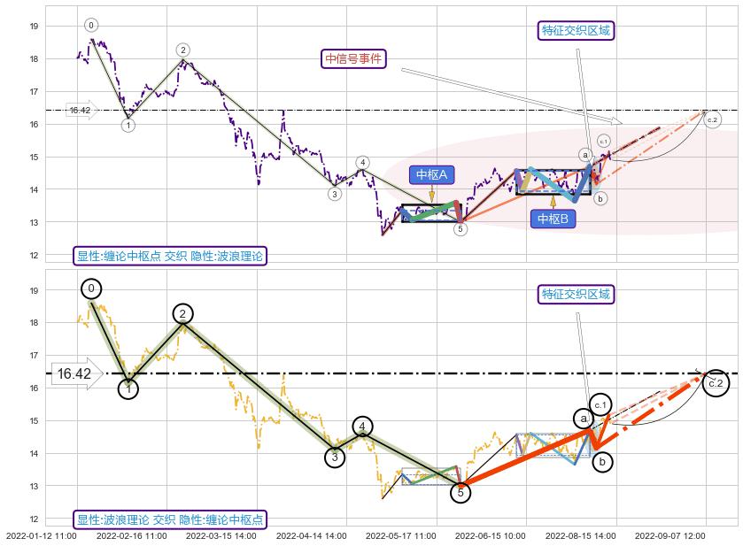 ➣ 【中枢B】:06-13:09-07-28:13,中枢由5笔构成,共83交易小时, ZG=14.55, ZD=13.93