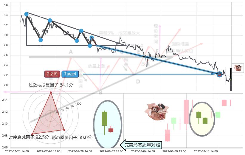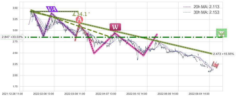 ♘ 阻力价格位2.847,可信任强度74.85%,距离最后交易2022-08-12 14:00形成的收盘价格2.140相差 +33.03%