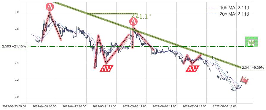 ♘ 阻力价格位2.593,可信任强度57.25%,距离最后交易2022-08-12 14:00形成的收盘价格2.140相差 +21.15%