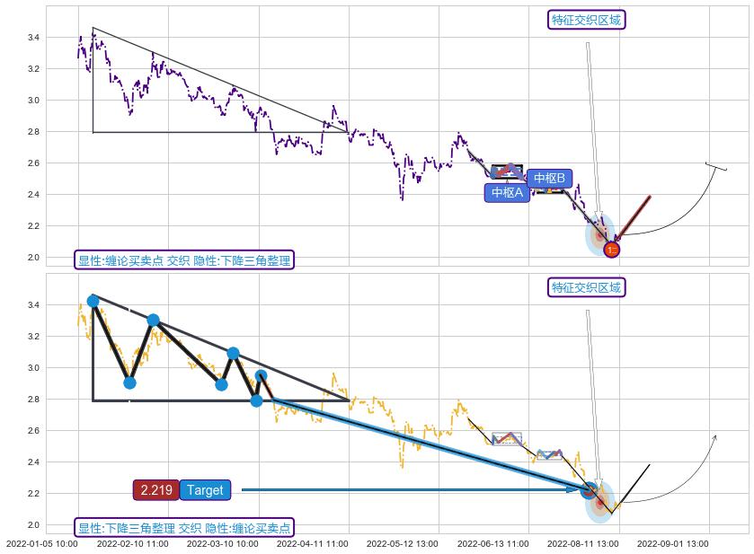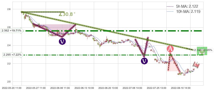 ♘ 在最后的下跌阶段2022-05-20 11:00至2022-08-08 14:00,存在 持续未破位的阻力位 ,阻力价格2.346,可信任强度86.90%,其距离最后价格2.140相差 +9.65%
