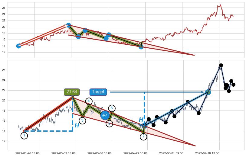➢ 最小中继整理涨幅→𝐇: 6.63 (𝐇楔型旗杆的长度:楔型起点→顶点)