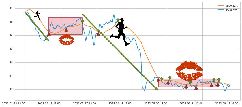 01-13 13:00至02-09 09:00 慢线与快线呈空头排列, 慢线与快线接触少,无缠绕