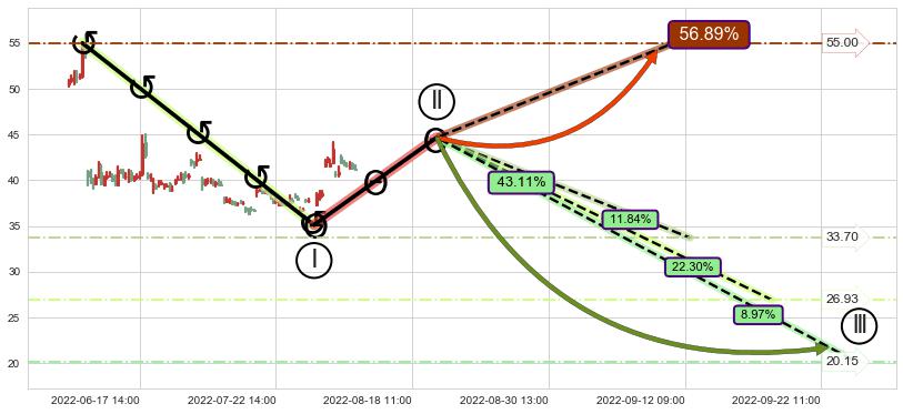 从2022-06-13 13:00至2022-08-05 13:00,共包含90个小时,阶段股价下跌-20.33%,阶段股价变动位移路程比: 1 : 8,下跌趋势角度: 44.6,2022-06-14 09:00向↘︎形成缺口,跳空下跌-24.86%˚