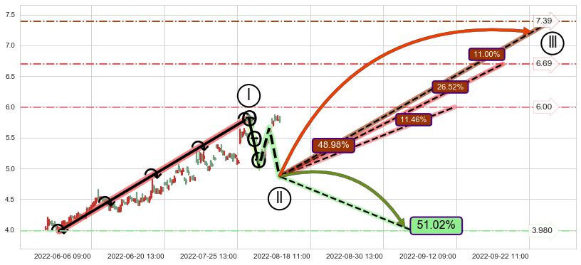 从2022-05-20 11:00至2022-06-07 11:00,共包含56个小时,阶段股价上涨9.71%,阶段股价变动位移路程比: 1 : 3