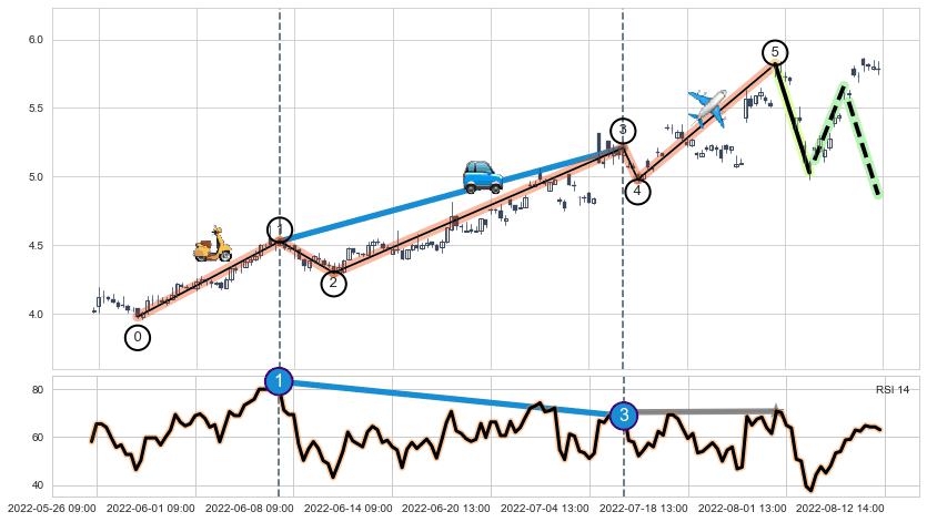➣ 【RSI】缠论走势出现【常规背离 & 反转信号】背离程度46.10%,背离夹角角度70.1˚,背离程度较大