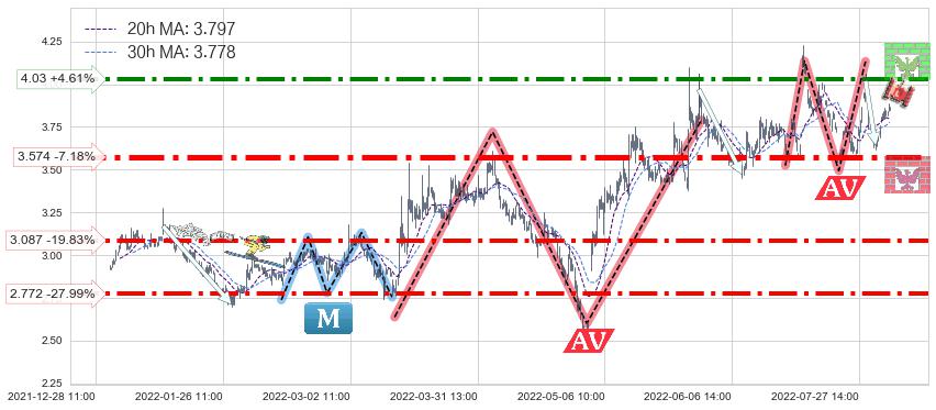 ♘ 阻力价格位4.03,可信任强度78.69%,距离最后交易2022-08-12 14:00形成的收盘价格3.850相差 +4.61%