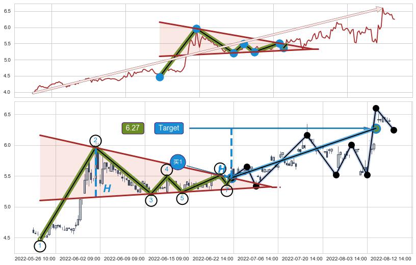➣ 上升对称三角整理:上涨目标target已达成:猜想强阻力位临近,预期回调下跌(均值回复)