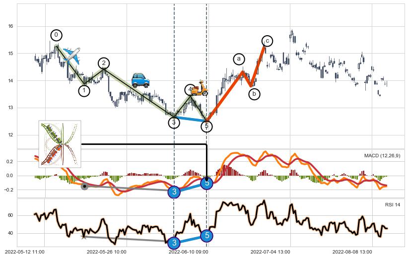 ➣ 第一, 三, 五浪下跌动能逐渐【衰弱变小】,趋势呈现不稳迹象