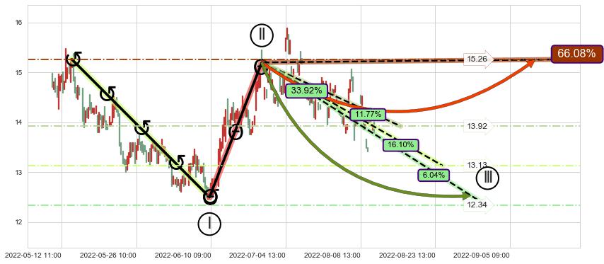 ♘ 支撑价格位13.12,可信任强度61.77%,距离最后交易2022-08-12 14:00形成的收盘价格13.87相差 -5.39%