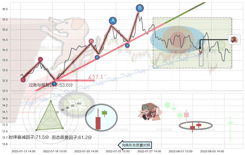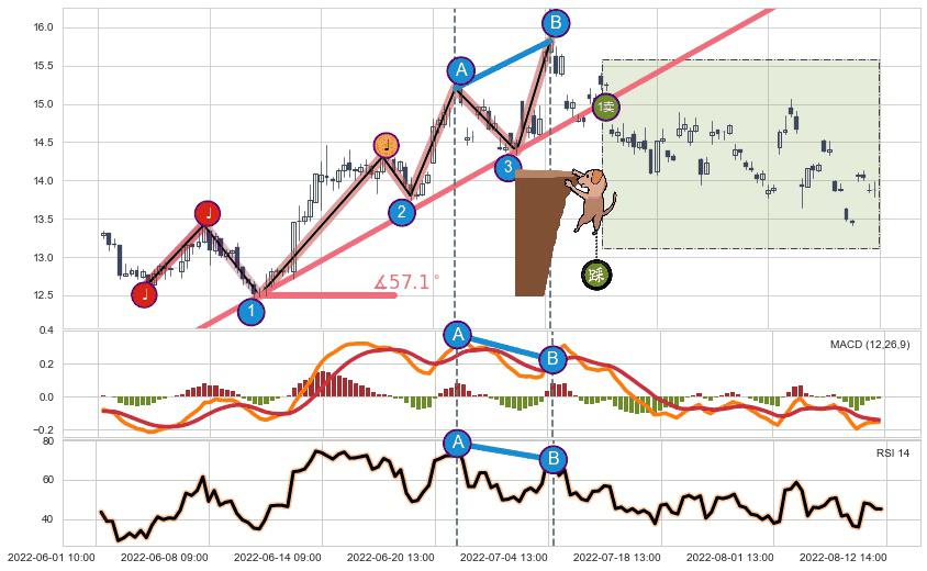 从2022-06-06 09:00至2022-07-15 13:00,共包含90个小时,阶段股价上涨14.10%,阶段股价变动位移路程比: 1 : 6,上涨趋势角度: 57.1