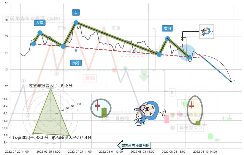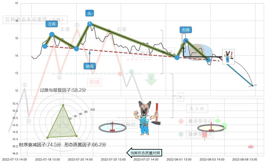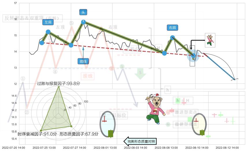 ➢ 【卖1】: 激进型 卖点→(08-10:13: 13.74 )形成突破头肩顶【反转】形态