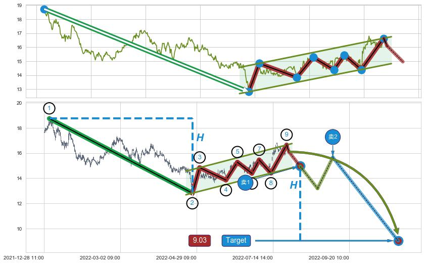 ➣ 最小中继整理跌幅→𝐇: 5.93 (𝐇旗杆的长度:旗杆起点→顶点)