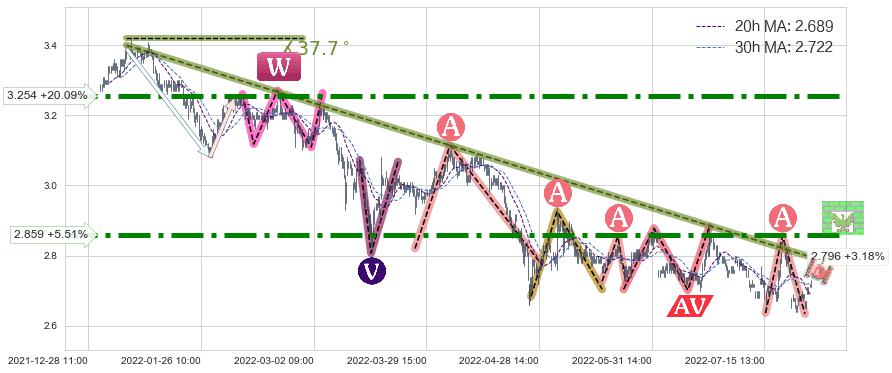 ♘ 阻力价格位2.859,可信任强度94.22%,距离最后交易2022-08-12 14:00形成的收盘价格2.710相差 +5.51%