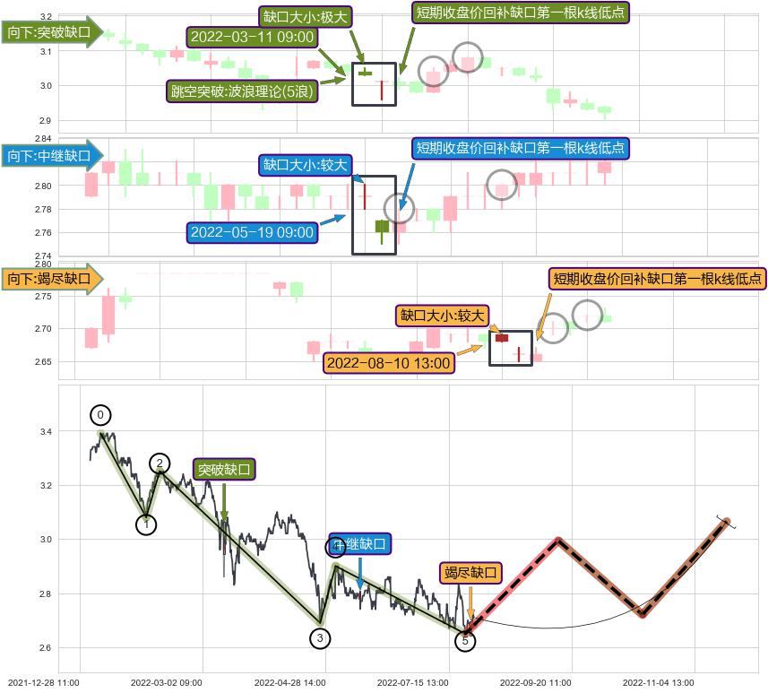 ➢ 突破缺口形成后,后续k已经超过14根,跳空突破波浪理论(5浪)关键点后, 出现【完全回踩】迹象, 但后续走势回踩幅度持续降低,缺口压制继续,短期收盘价回补缺口第一根k线低点