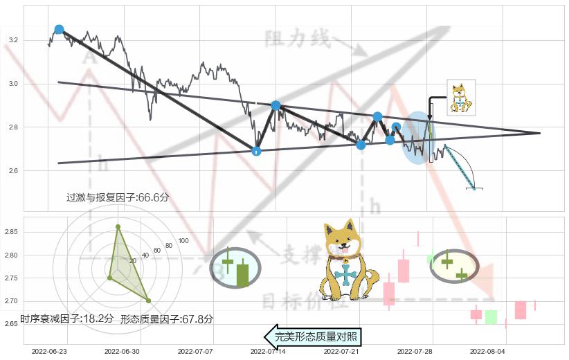 ➢ 顶部尽头线(下山虎) 🔜 下降对称三角整理支撑破位转换阻力下跌 综合量化分数:46.34 【中性】