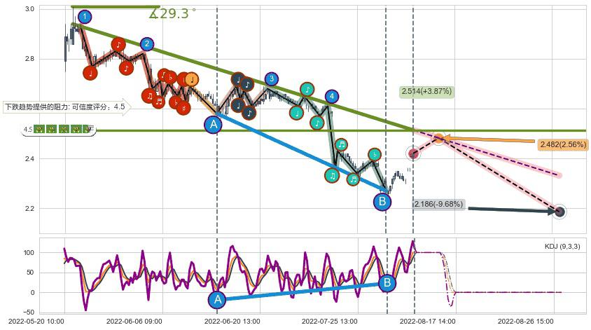 ♘ 在最后的下跌阶段2022-05-23 09:00至2022-08-11 14:00,存在 持续未破位的阻力位 ,阻力价格2.514,可信任强度87.63%,其距离最后价格2.420相差 +3.87%