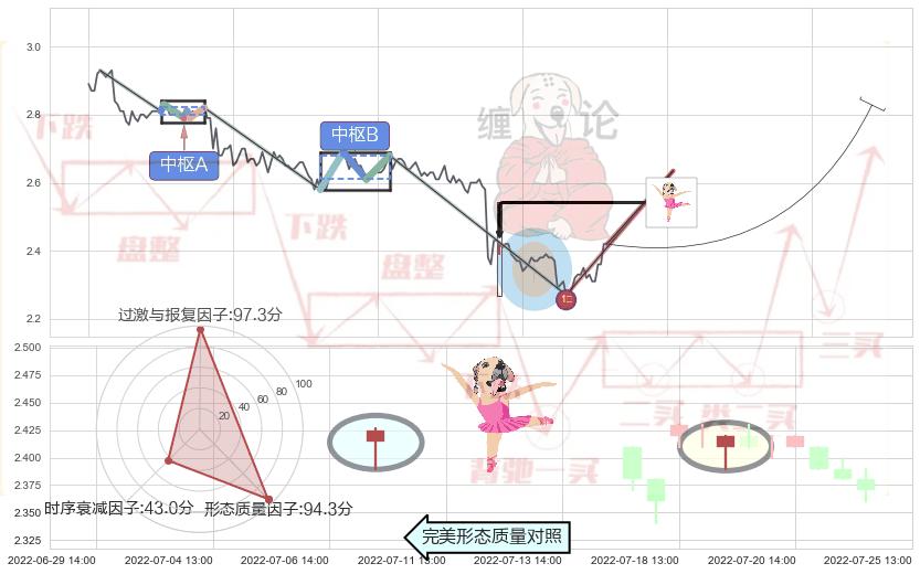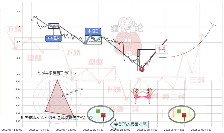 从2022-05-23 09:00至2022-08-11 14:00,共包含174个小时,阶段股价下跌-20.65%,阶段股价变动位移路程比: 1 : 5,下跌趋势角度: 29.3,2022-07-15 13:00向↘︎形成缺口,跳空下跌-7.75%˚