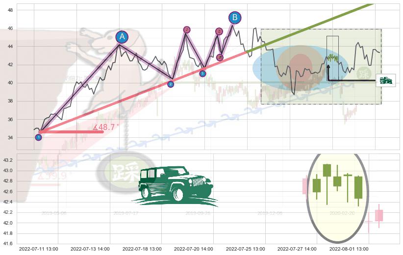从2022-07-15 14:00至2022-08-12 14:00,共包含41个小时,阶段股价上涨12.04%,阶段股价变动位移路程比: 1 : 4