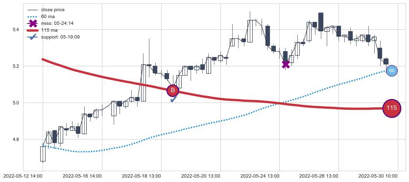 📝 多条均线形成死叉后走势最低价格达到: 4.75