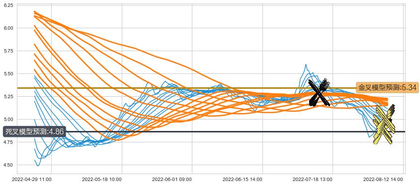 ➢ 45小时均线于(07-08 14:00: 5.30)形成【死叉】基于【死叉历史模型】预测死叉后最低波谷价格: 4.95, 死叉后最低价格4.75,已经下跌超出预测最低波谷价格, 预期反弹