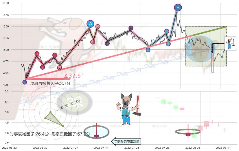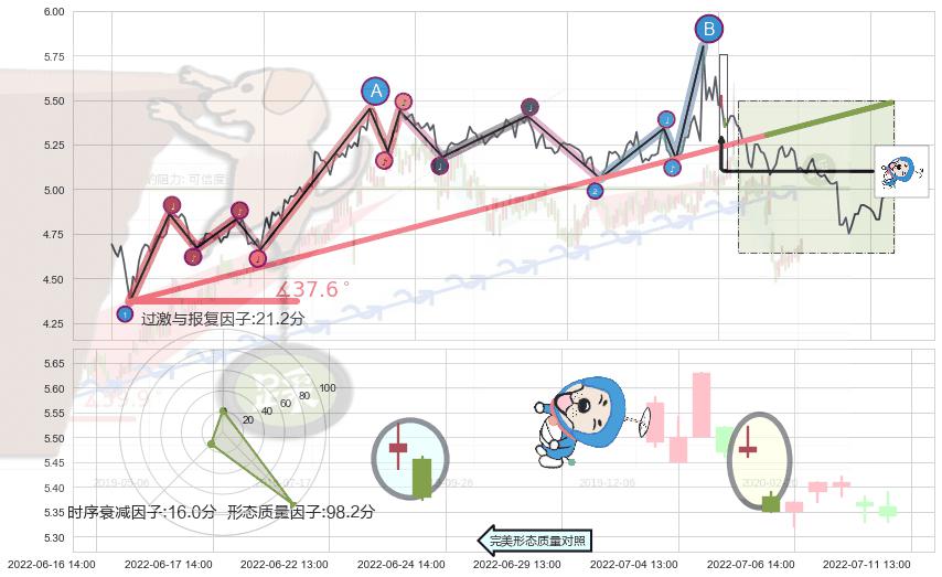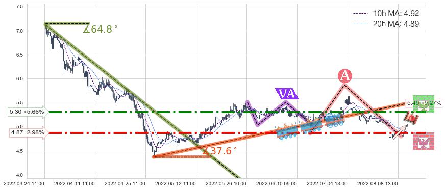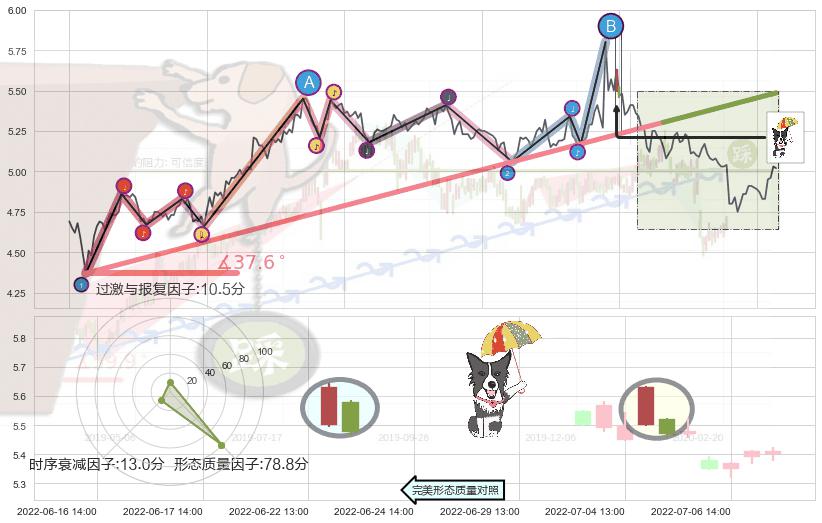 ➣ 2022-04-27 09:00-2022-07-15 13:00上升趋势存在反转[风险],其原上升趋势的支撑位(5.49)已破位[强阻力信号],原上升趋势角度: 37.6˚