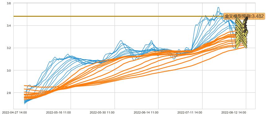 ➢ 100小时均线于(08-10 14:00: 3.299)形成【金叉】基于【金叉历史模型】预测金叉后最高波峰价格: 3.502, 金叉后最高价格3.450,尚未达到预测最高波峰价格, 预期继续上涨