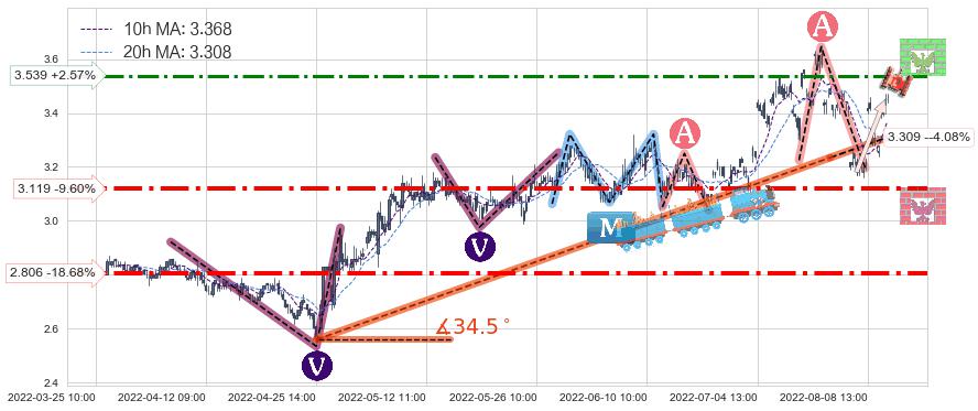 ♘ 阻力价格位3.539,可信任强度57.00%,距离最后交易2022-08-12 14:00形成的收盘价格3.450相差 +2.57%